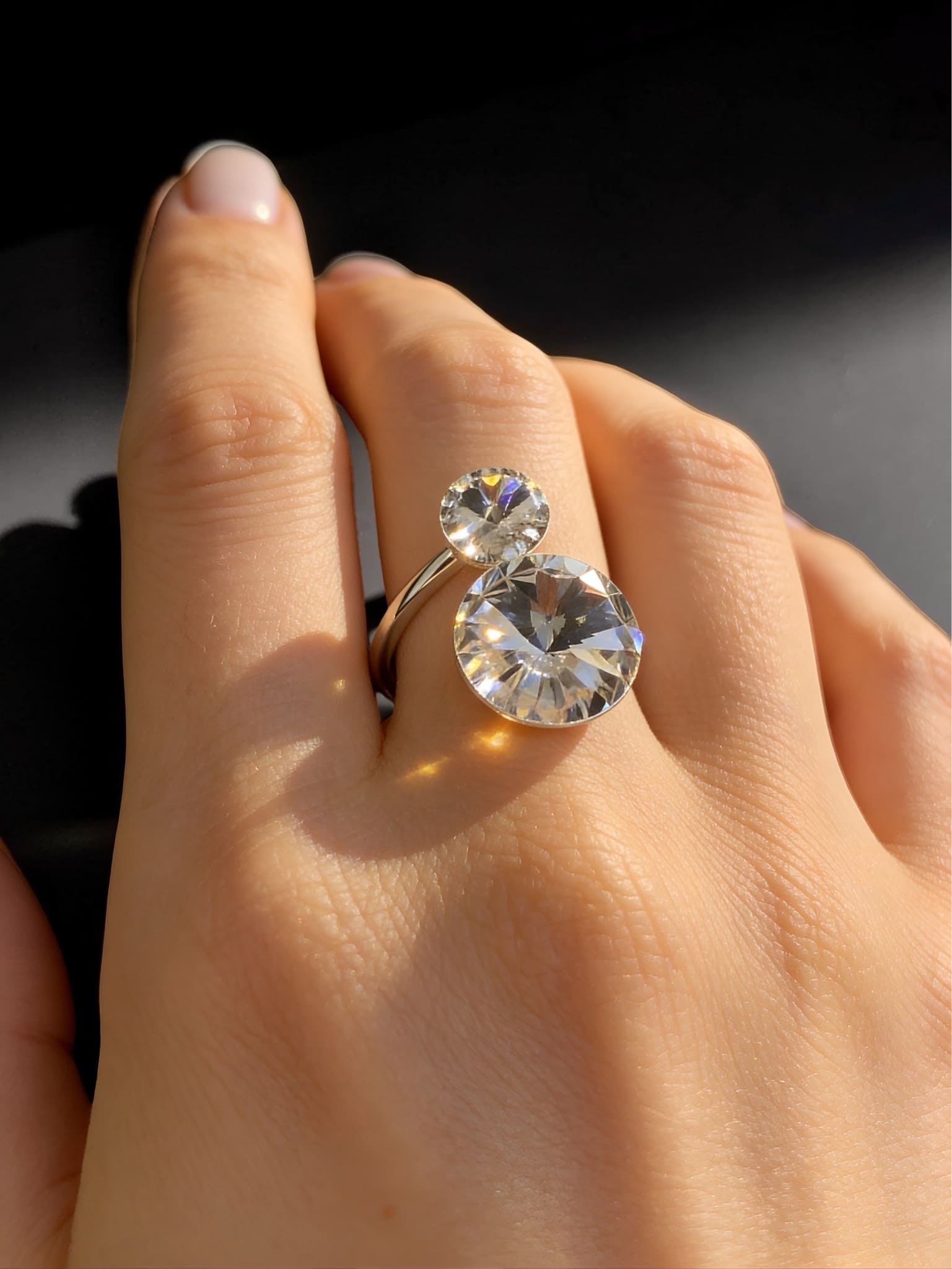 Кольцо женское двойное, с австрийскими кристаллами. Цвет -Crystal. Диаметр кристаллов - 8/14 мм, размер кольца регулируется от 17 до 19. Гальваническое покрытие бижутерии: гипоаллергенное- Rhodium (Rh) Родий. Не вызывают аллергию. Упаковано с приложением инструкции по использованию. Рекомендуем внимательно ознакомиться, что позволит продлить срок носки. Данная популярная модель зарекомендовала себя как лидер продаж. Безупречный блеск и форма сделают ваш образ стильным, а подарок идеальным!