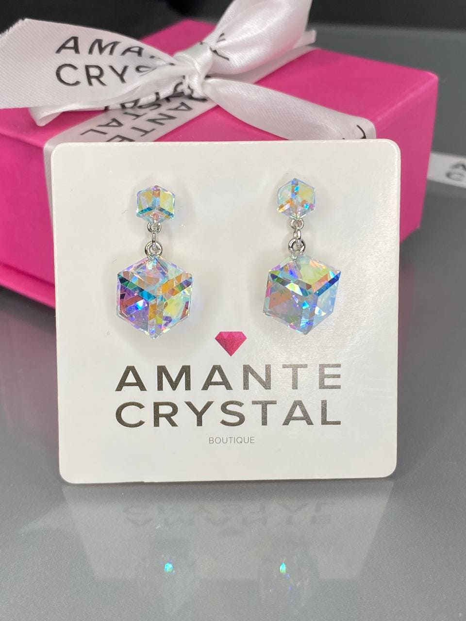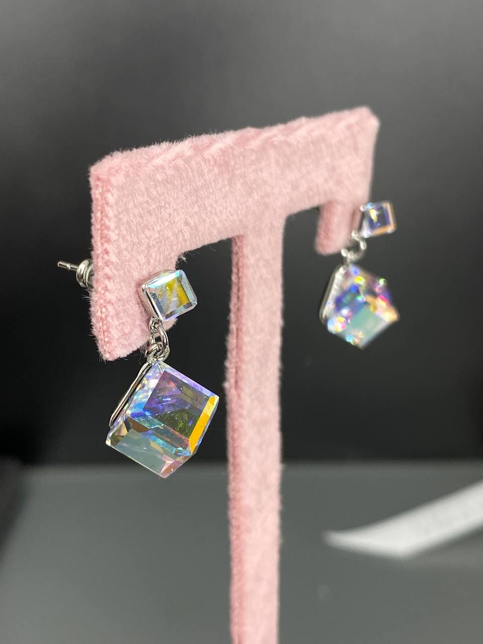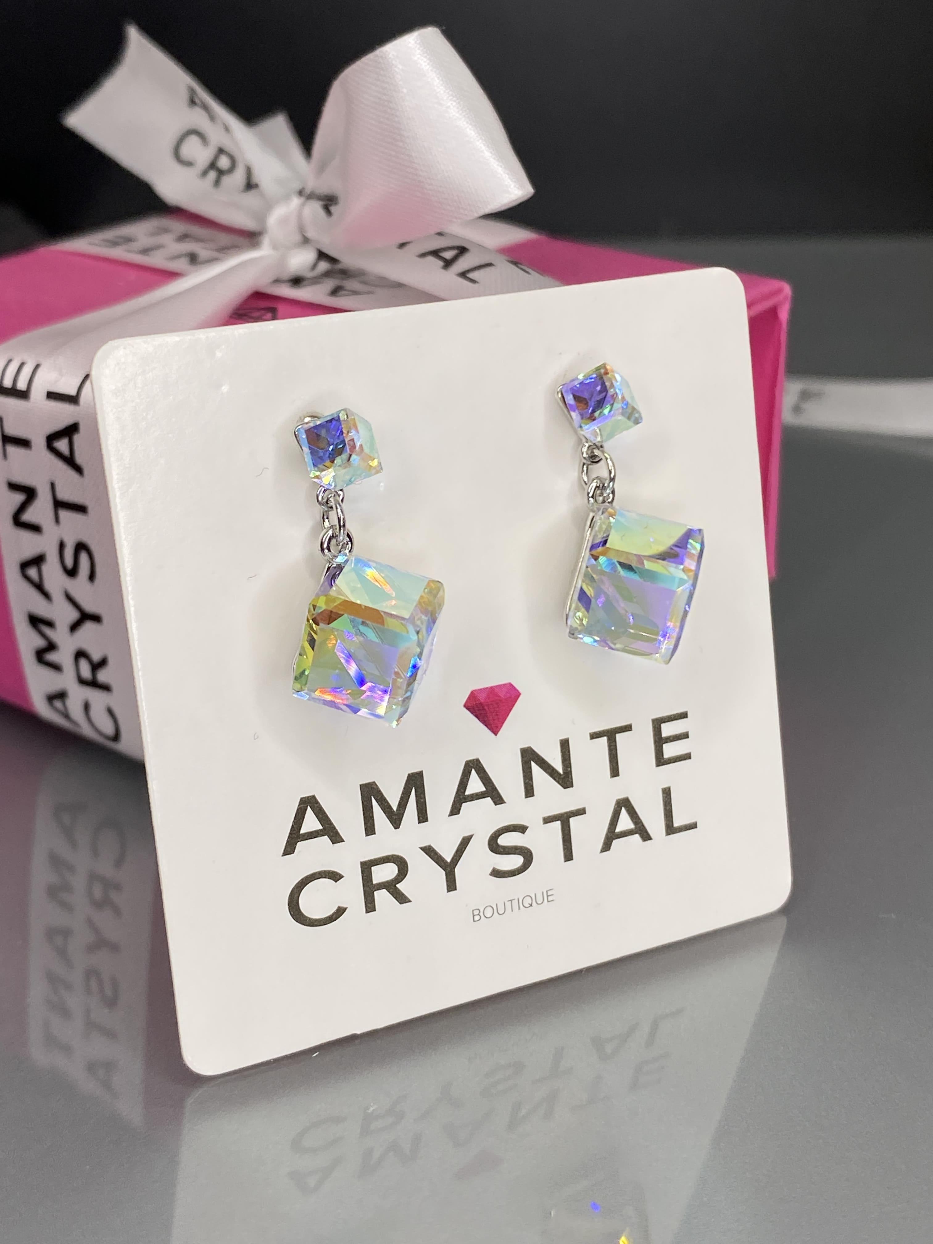 Цвет вставок -Crystal AB. Размер кристаллов кубиков - 4 и 8 мм, общая высота изделия - 20 мм. Замочек гвоздик c железными заглушками надежный и удобный. Гальваническое покрытие бижутерии: гипоаллергенное: Rhodium (Rh) Родий. Серьги блестящие и комфортные в носке, не вызывают аллергию Прилагается инструкция по уходу за изделием. Внимательно ознакомиться с инструкцией, чтобы продлить срок носки вашего украшения.