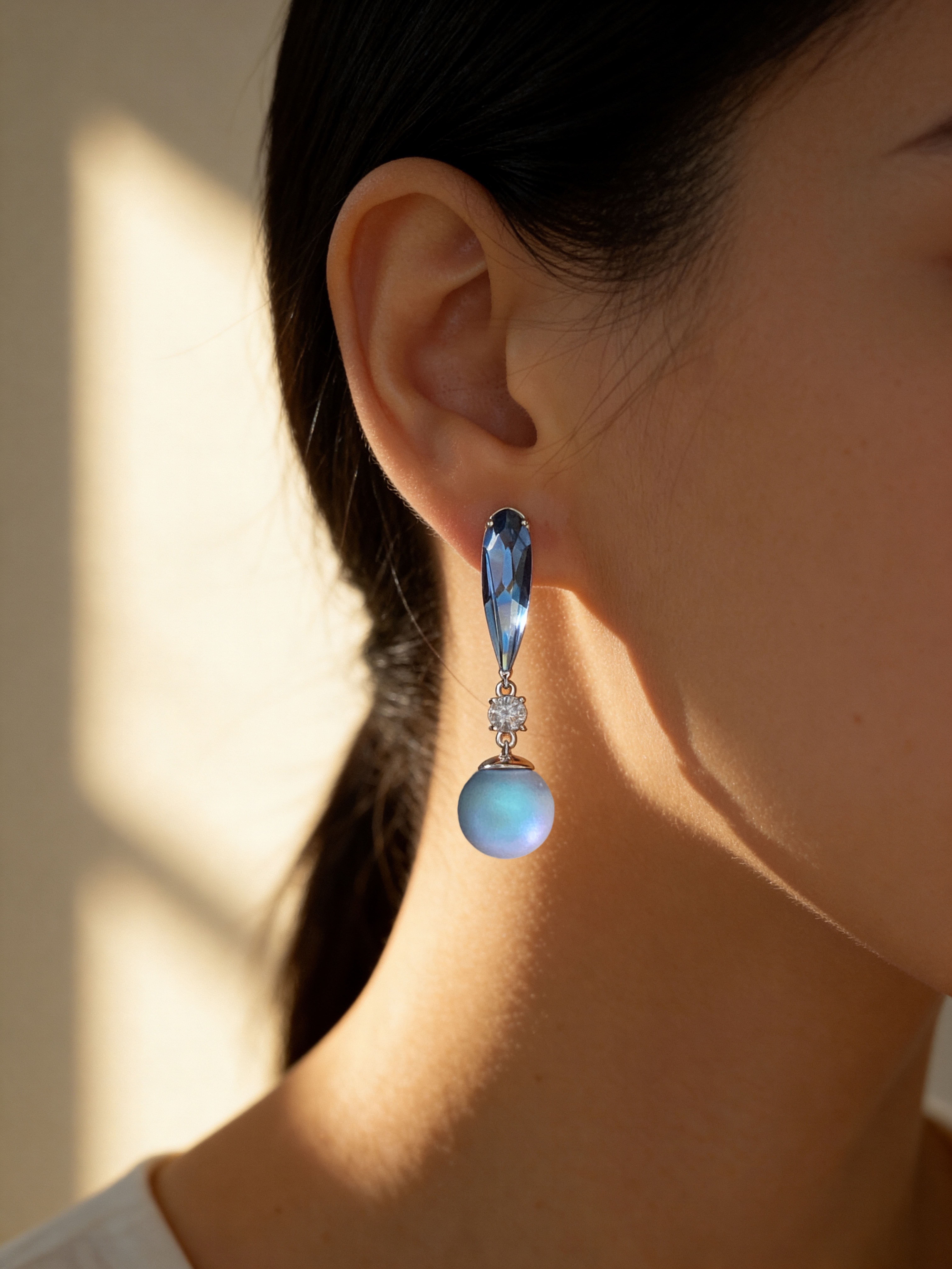Яркие женские серьги с кристаллами в виде капли в цвете denim с цирконом и жемчужиной. Высота изделия: 10 мм. Ширина изделия: 4 см. Вес изделия: 2 г. Это прекрасный подарок на праздник жене, любимой, девушке, дочери, маме, бабушке, подруге, коллеге. Отличный подарок на юбилей, день рождения, праздник, 8 марта, Новый год, 14 февраля. Ко всем украшениям с кристаллами прилагается рекомендация по носке и уходу за нашими изделиями.